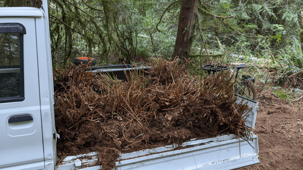 I’ve been out of town for a few weeks, and now it’s getting cold, wet, and dark. In one of my larger stands of alder and salmonberry that gets the best spring and summer sun, I started coppicing tall (~6ft+) shrubs of salmonberry and osoberry, and some alder saplings. I’m getting it on the ground and decomposing now. In the spring, it’ll be less competition for sunlight. TBD on what to do with the sword and bracken fern.