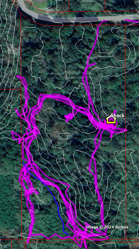 Recorded tracks from today’s trail cutting to the Southwest corner of the lot: